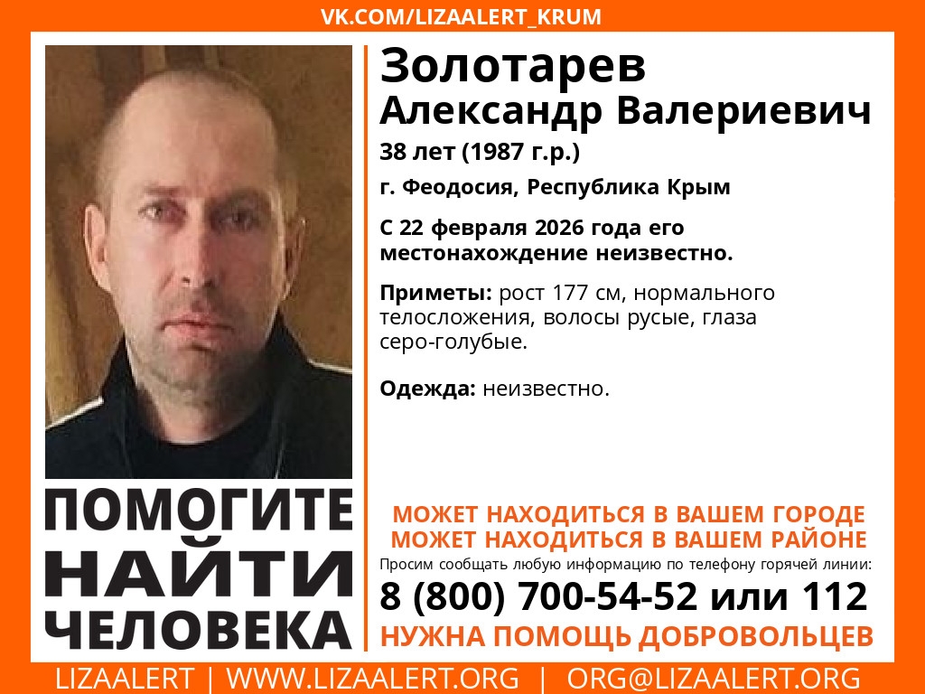 «Внимание! Помогите найти человека! Пропал Золотарев Александр Валериевич, 38 лет. Город Феодосия, Республика Крым», — указано в сообщении.