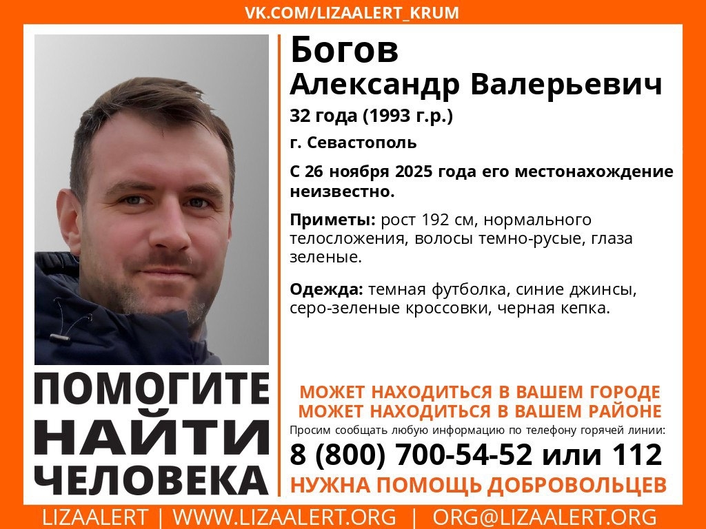 «Внимание! Помогите найти человека! Богов Александр Валерьевич, 32 года, г. Севастополь», — указано в сообщении организации.