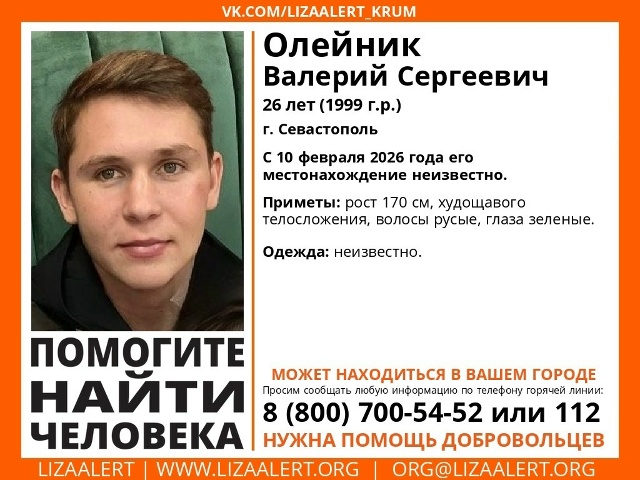 В Севастополе пропал Олейник Валерий Сергеевич, 1999 года рождения. С 10 февраля 2026 года его местонахождение неизвестно. Об этом сообщили в поисковом отряде «Лиза Алерт Крым» в соцсети «ВКонтакте».