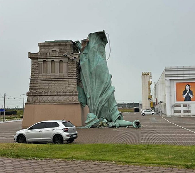Монумент, имитирующий американскую статую Свободы, в городе Гуаиба (штат Риу-Гранди-ду-Сул) в Бразилии рухнул во время шторма, у скульптуры оторвалась голова, передает g1.