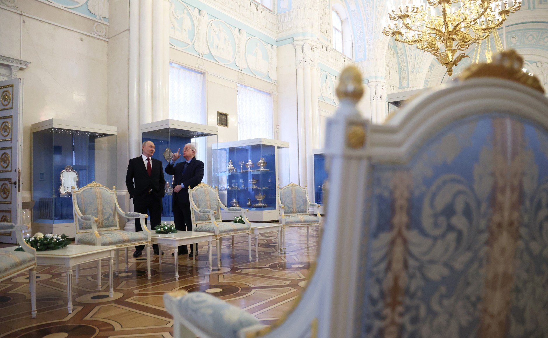 Пиотровский согласился и отметил, что их носили для красоты. «Те, кто носили это, не занимались дома хозяйством», — добавил директор музея, чем вызвал улыбку у глав государств.