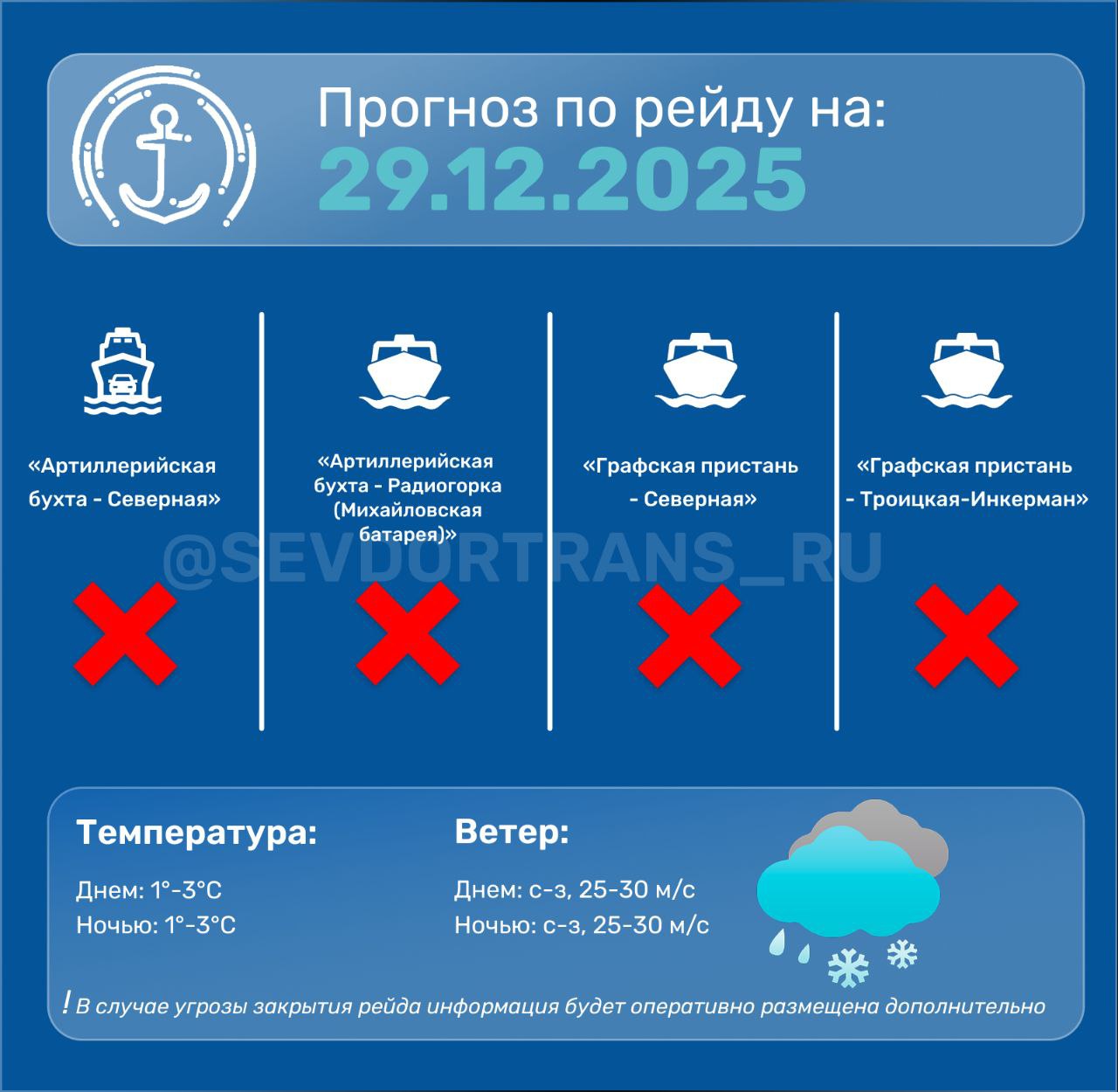 В Севастополе морской транспорт 29 декабря приостановил движение. Об этом сообщили в Telegram-канале «Транспорт Севастополя».