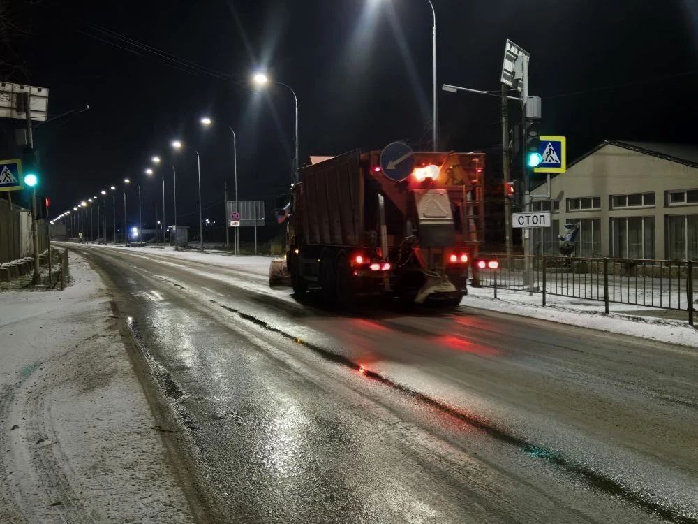Температура около 0…–1 °C, без осадков. Покрытие мокрое, проводится обработка, движение обеспечено.