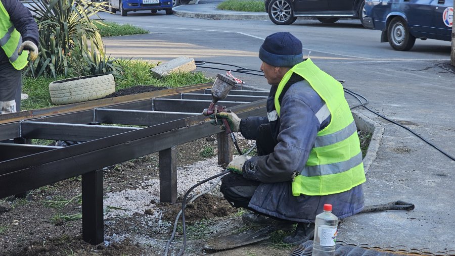 Конструкция полностью соответствует ГОСТ и техническим нормам: уже установлены несущие колонны из профильных труб, смонтирован каркас, забетонированы закладные. Сейчас рабочие окрашивают металлоконструкцию, после чего приступят к укладке нескользящего покрытия и монтажу перил.