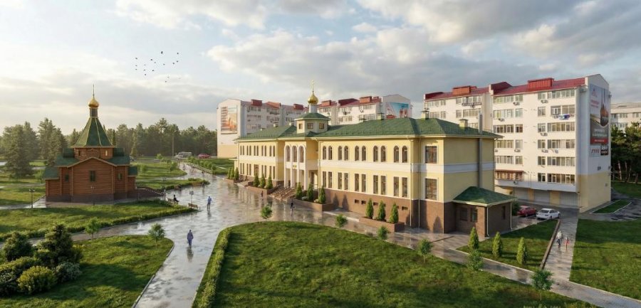 «При разработке концепции авторы сознательно отказались от нейтральных современных решений в пользу сдержанной стилистики, деликатно перекликающейся с традиционной застройкой. Главный фасад решен симметрично, а компактный двухэтажный объем акцентирован небольшим купольным элементом. По задумке архитекторов, эта деталь носит символический характер: она помогает обозначить функцию здания в рамках храмового комплекса, но не формирует новой доминанты и не конкурирует с основным храмом, а лишь поддерживает его образ на уровне архитектурной ассоциации», — говорится в сообщении. Внутренняя планировка строго подчинена социальной миссии объекта: первый этаж отведен под открытые общественные пространства — трапезную, церковную лавку и учебные классы, второй этаж занят жилыми номерами для мам с малышами. В центральной части комплекса, согласно утвержденному плану, разместится небольшая часовня.