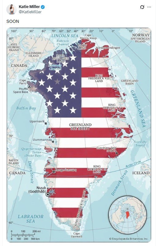 Мировые СМИ также обратили внимание на публикацию супруги замглавы администрации Белого дома Стивена Миллера Кэти Миллер, которая выложила карту Гренландии в цветах флага США с подписью «скоро».