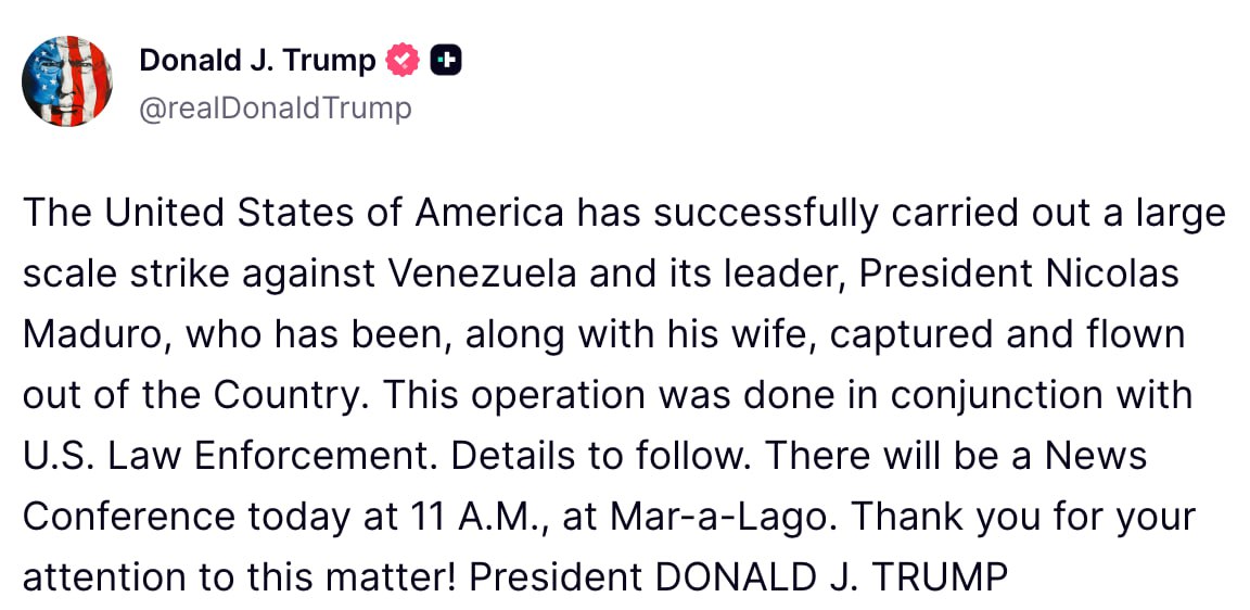 «США успешно провели крупномасштабную операцию против Венесуэлы и ее лидера. Президент Мадуро вместе со своей женой был схвачен и вывезен из страны», — написал в своей соцсети Дональд Трамп.